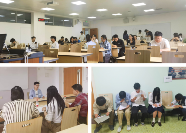 面试现场,学院精心组织了21位资深教授和青年教师组成的面试专家团,他们凭借深厚的学术造诣和丰富的教学经验,从英语能力、专业知识、综合素养等多个维度对申请者进行严谨考察。由15位学生志愿者和5位辅导员组成的辅助团队为面试流程提供了周到保障,从签到引导到考场服务,每个环节尽显专业严谨。面试学子们在候考区交流学术见解、分享科研经历,现场气氛虽紧张却充满学术活力。