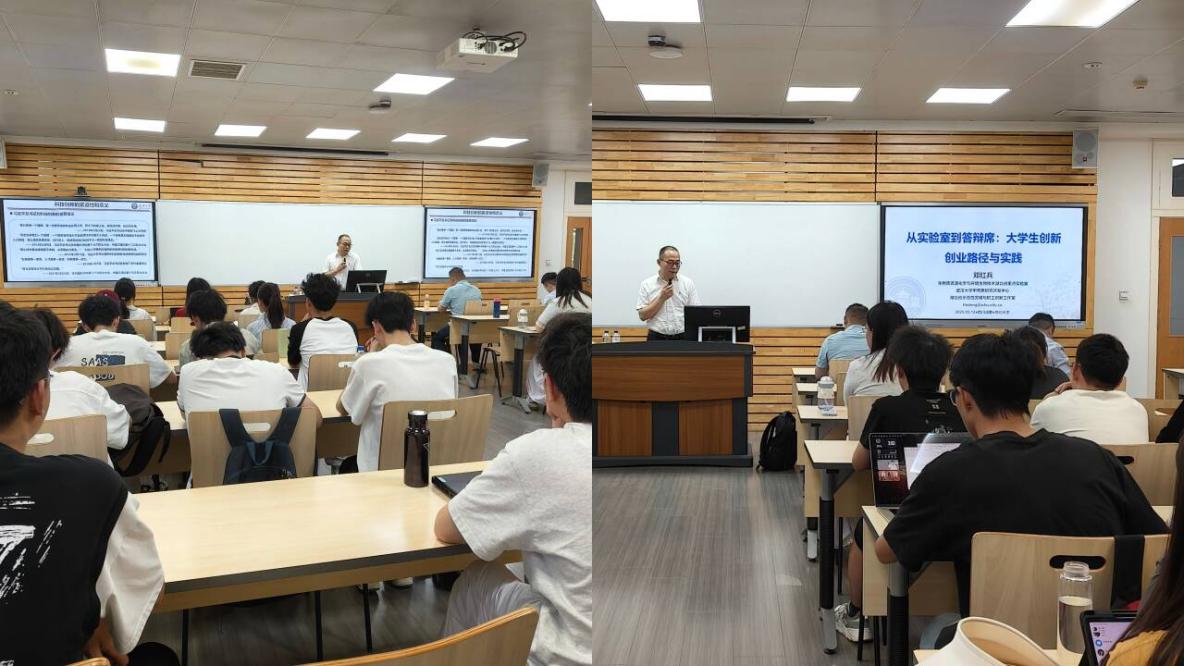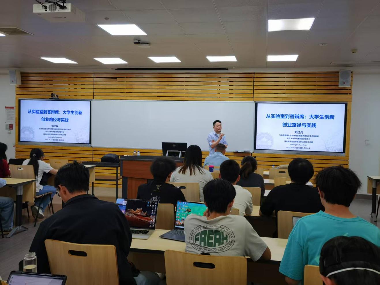 图 3讲座现场 邓红兵教授立足多年指导国家级大创项目的经验,从“科研选题、团队建设、项目申报、成果转化”四大维度系统剖析大学生双创实践路径。针对科研入门难点,他深入解析项目申报书的核心逻辑,强调“创新性需立足实际需求,可行性依托数据支撑,社会价值贯穿项目始终”,并通过对比正反案例,拆解优秀申报书的框架设计与论证技巧。针对学生常见误区,他提出“强化跨学科协作、注重市场调研前置、构建多维验证体系”等解决方案,为初涉科研的学生提供清晰行动指南。 结合“挑战杯”“互联网+”等赛事案例,邓红兵教授重点阐释了科研成果向竞赛项目转化的关键策略。他建议学生以社会痛点为突破口,聚焦“小而精、真而实”的研究方向,同时注重成果的可视化表达与知识产权保护,并分享了团队分工、答辩陈述等实战经验。