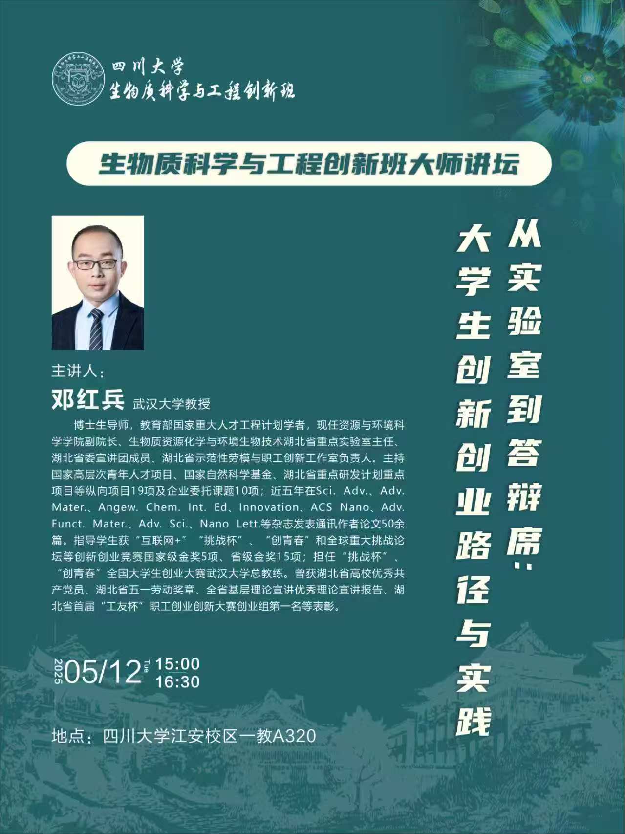 图 1 活动海报 为深化创新创业教育,提升学生科研实践能力,5月12日下午15:00,生物质科学与工程创新班【大师讲坛】特邀武汉大学资源与环境科学学院,武汉大学双创竞赛“总教头”邓红兵教授在江安校区一教A320为创新班同学们举办了一场题为《从实验室到答辩席:大学生创新创业路径与实践》的专题讲座。会议由陈意教授主持,讲座吸引了众多师生参与,现场氛围热烈。