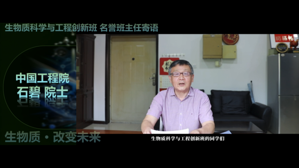 (彭必雨院长致辞) 紧接着,中国工程院院士石碧教授通过视频方式发表深情寄语。石院士站在国家战略和学科发展的高度,阐述了生物质科学与工程的重要性和发展前景。石院士表示,随着全球对可持续发展的关注度不断提高,生物质科学与工程作为一门新兴交叉学科,肩负着解决资源短缺、环境污染等重大问题的使命。学院设立生物质科学与工程创新班,正是为了培养一批具有创新精神和实践能力的高素质人才,满足国家和社会对该领域专业人才的迫切需求。石院士鼓励同学们要敢于挑战科研的“无人区”,勇于冲击学术前沿的“制高点”,努力在生物质科学与工程领域取得创新性成果。